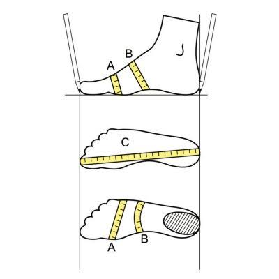 برای دوخت سفارشی کفش، علاوه بر اندازه طول پا (اندازه C در تصویر بالا)، نیاز به اندازه گیری پهنای پنجه (اندازه A( و ارتفاع قوس پا (اندازه B) است.