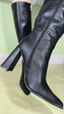 جزئیات و بسته شدن: بوت دارای یک زیپ سراسری در قسمت کناری ساق است. رنگ زیپ طلایی است که تظاد زیبایی با چرم مشکی براق ایجاد کرده و به عنوان یک عنصر تزئینی نیز عمل می کند.